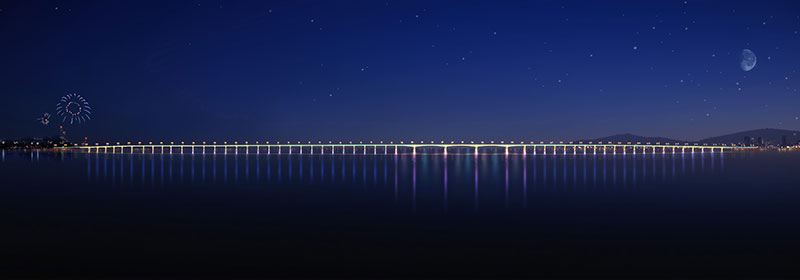 大橋工程分為主橋、預制段引橋和北側現(xiàn)澆段引橋,其中主橋長500米,主跨為120米的大跨變截面預應力混凝土連續(xù)箱梁,是當時東北地區(qū)跨度最大的連續(xù)梁跨海橋。大橋的設計結合了使用和景觀的雙重功能,作為普灣經(jīng)濟區(qū)核心位置的地標性景觀,獨具特色的夜景設計使其成為經(jīng)濟區(qū)一道亮麗的風景線。